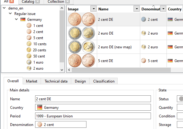 При натискане на някоя монета в таблицата с монети се показва подробна информация: в панела Изображение - снимки на монети, дървото се разгъва до елемента, описващ монетата, информационният панел показва всички въведени монетни данни.
